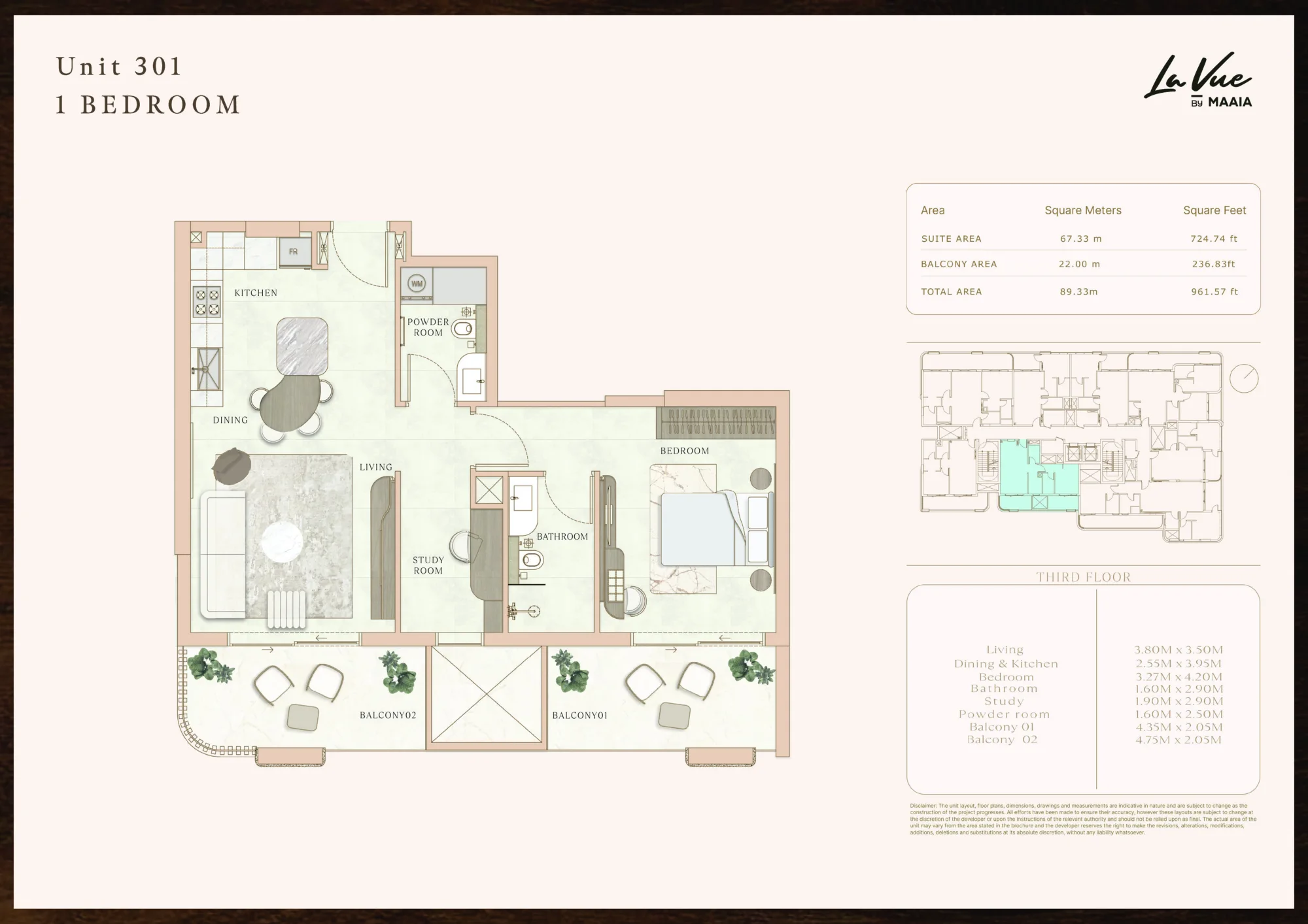 La Vue offers a boutique collection of 1 to 3-bedroom apartments. Residences range from 760 to 2,168 sq. ft., featuring open-plan layouts, private balconies or terraces, and full-height windows overlooking Nad Al Sheba Gardens. Selected 3-bedroom apartments include maid’s rooms or private pools.